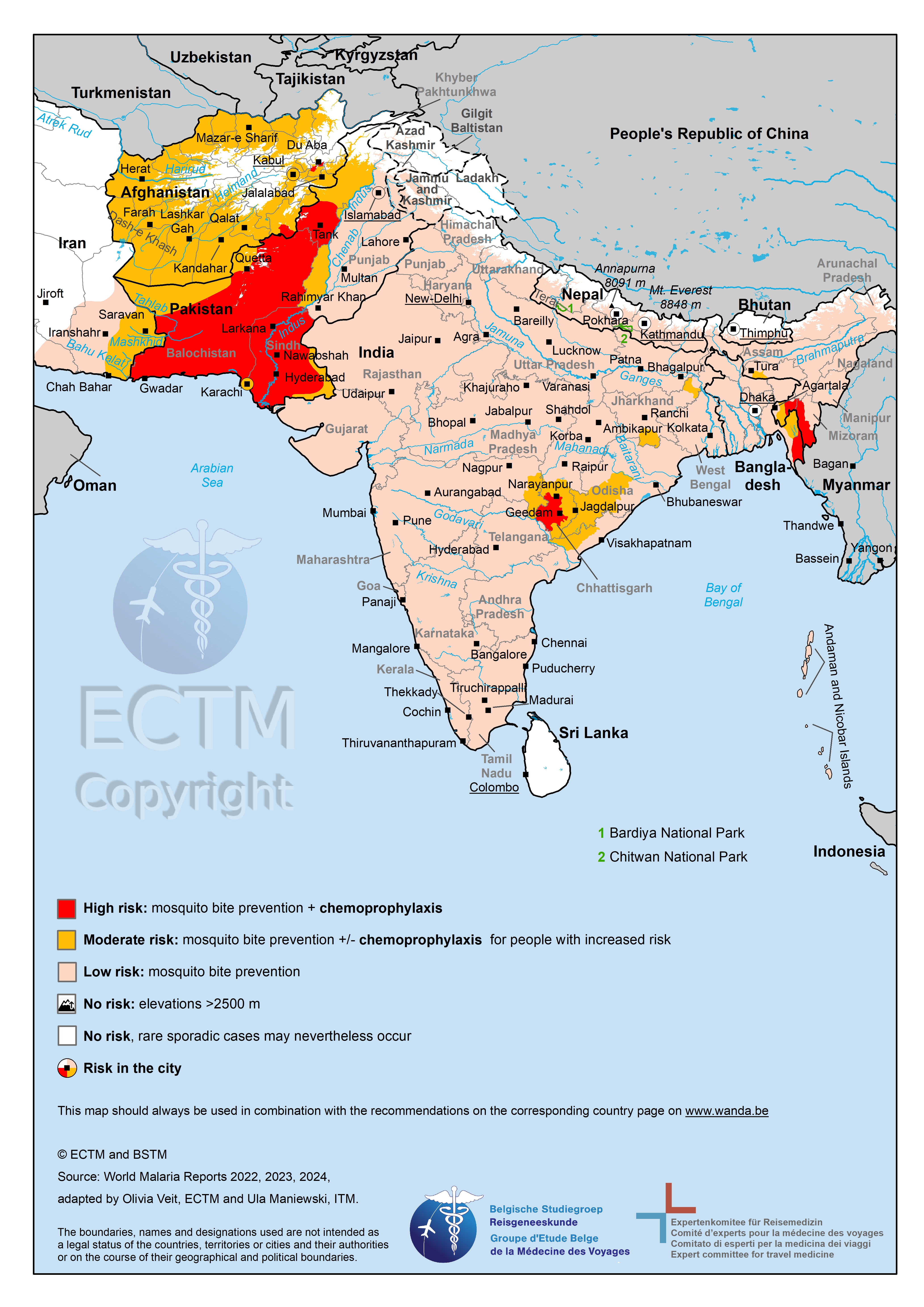 - In the red regions, we recommend mosquito prevention and the intake of malaria tablets and the risk is high.