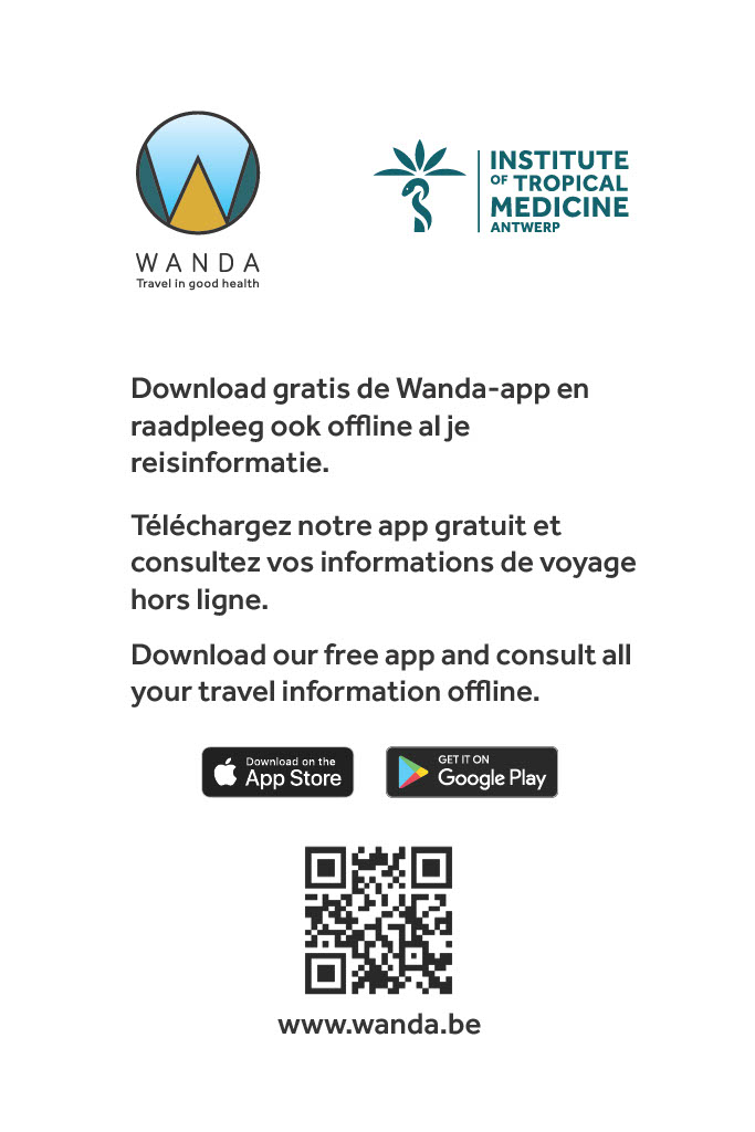 Wanda is a product of the Institute of Tropical Medicine (ITM) in Antwerp, developed according to the vision of Mieke Croughs. It is based on information from the World Health Organisation (WHO), the opinions of the Superior Health Council, and guidelines prepared by the Belgian Study Group for Travel Medicine. The website and application came about with financing from the Flemish Department of Care.